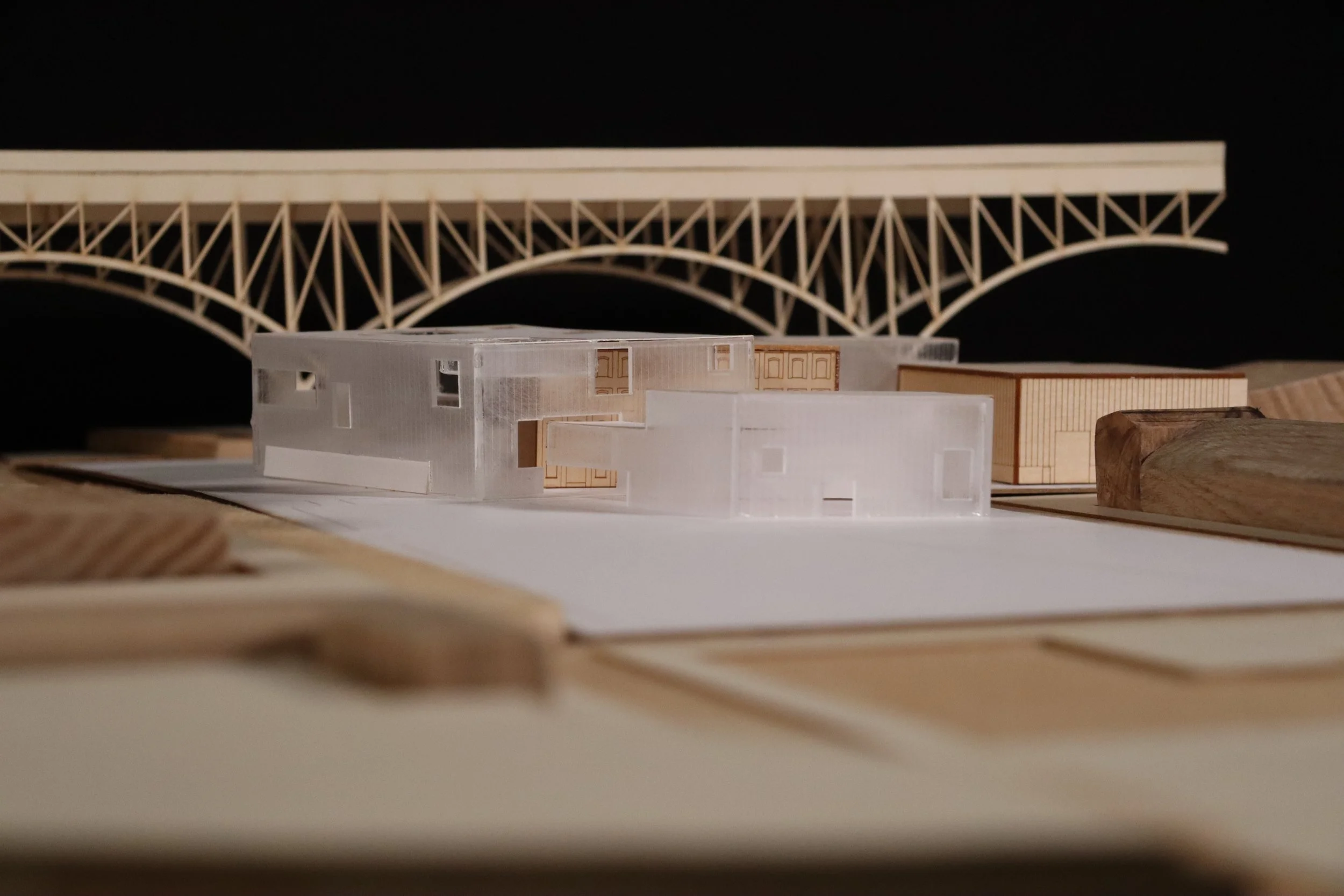 This project uses a material, structural, and organizational framework to unify existing buildings with new construction and create a cohesive tectonic throughout. It also seeks to utilize the unique properties of CLT to interlock and layer both materials and spaces. In the process of replacing parts of the existing, I uncovered an underlying organizational system that I slightly edited to accommodate for certain programs. The material can adapt physically at different scales such as dovetailing between brick columns, finger locking into individual blocks, and interlocking with itself to create furniture or circulation. By using a layered approach, the material can also adapt to achieve certain densities of spaces, sound, and light. The layering of program in different densities starts to create more public areas towards the bridge and more private by the parking lot. From there, wooden panels can be filled in between, over, or onto the CLT to determine interior vs exterior, public vs private, or density of sound and light within a space. The public is drawn in from a digital gallery and then led up the cascading platforms or around the side to the main entrance. The other half of the site filters people from the trail through the middle of the project to an extension of the trail. Or students and faculty can enter from the parking lot to access spaces for learning and producing that work towards performing. The layering of material and spaces allows for the new to conform to the existing, organization of programming, and better control of the density of spaces.
