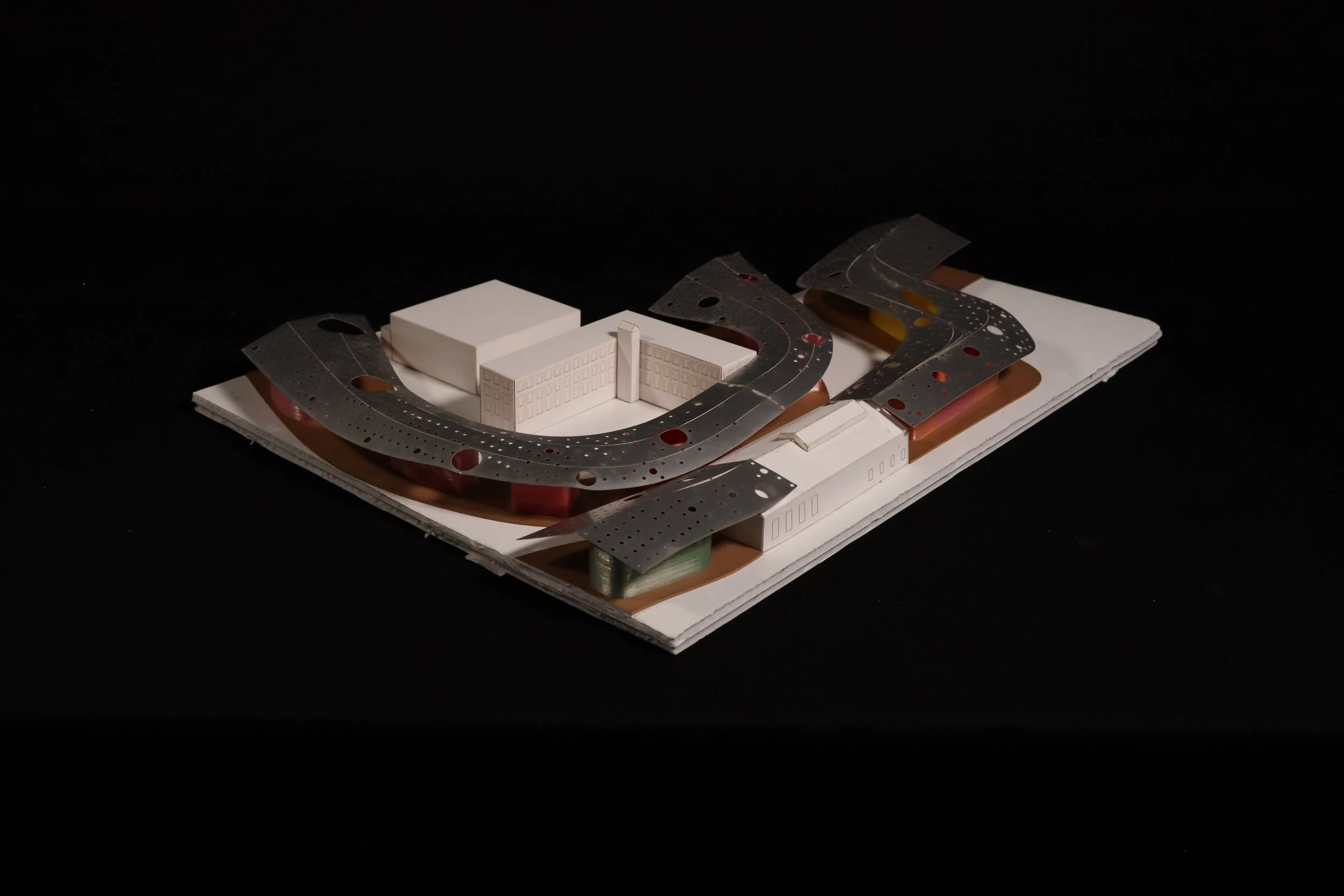 The studio explored the opportunities of blending existing infrastructure with new programs. Typically, new and old do not fit perfectly together producing moments of misalignments. The studio performed a series of operations to develop an outcome that was not known at the start, but only revealed by the process itself. These types of interactions or collisions have the opportunity to generate new environments that can lead to a more inclusive architecture and education process. Through the program, we investigated shape and material and their direct relationship between the interior and exterior to generate new outcomes of how a media art school functions.