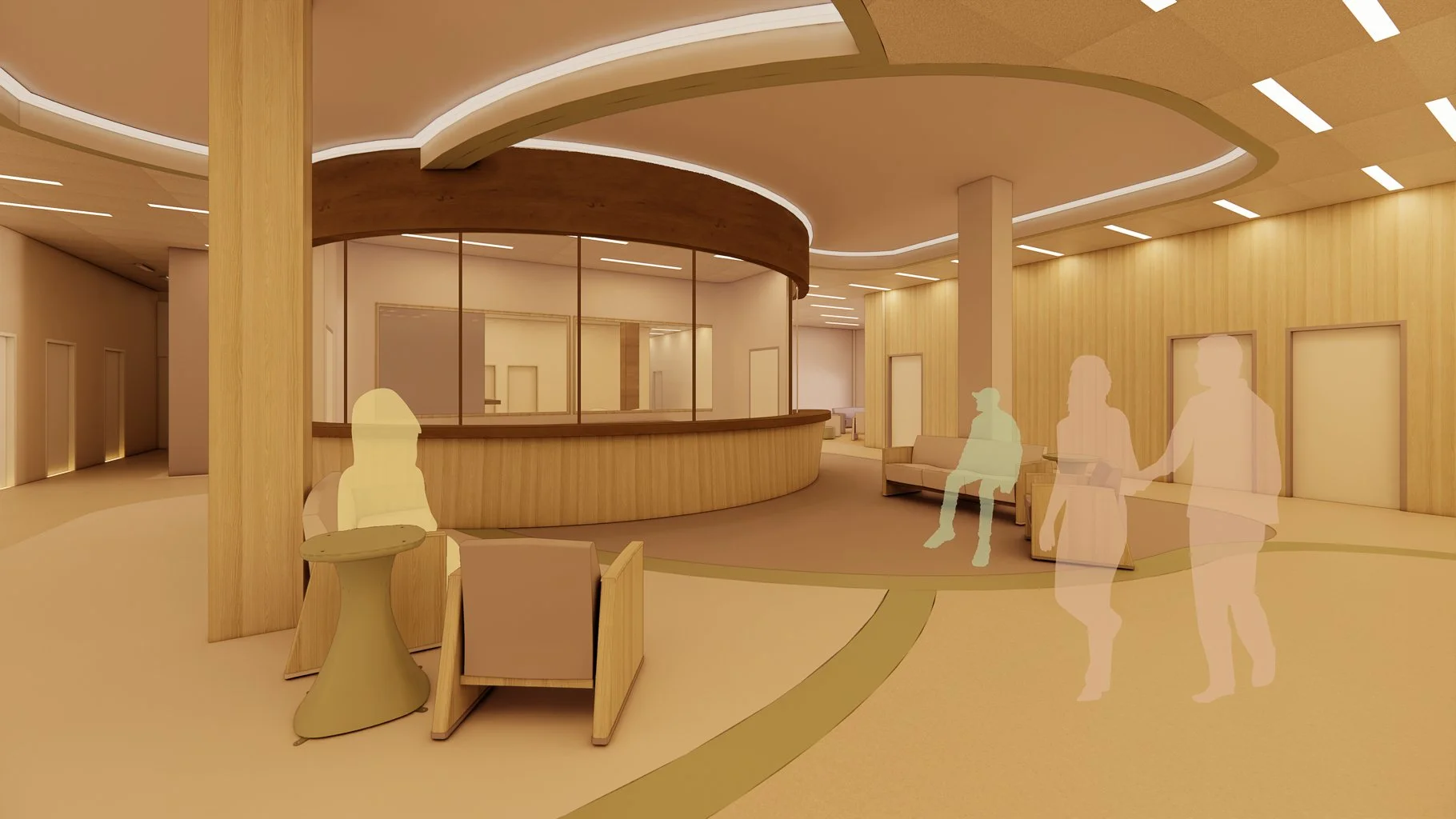 The design should include spaces that support healing, intuitive wayfinding, and evoke confidence and trust for adult patients, and their families. The design should support a seamless interaction for patients, families, and care staff to optimize the experience and outcomes through interior design.