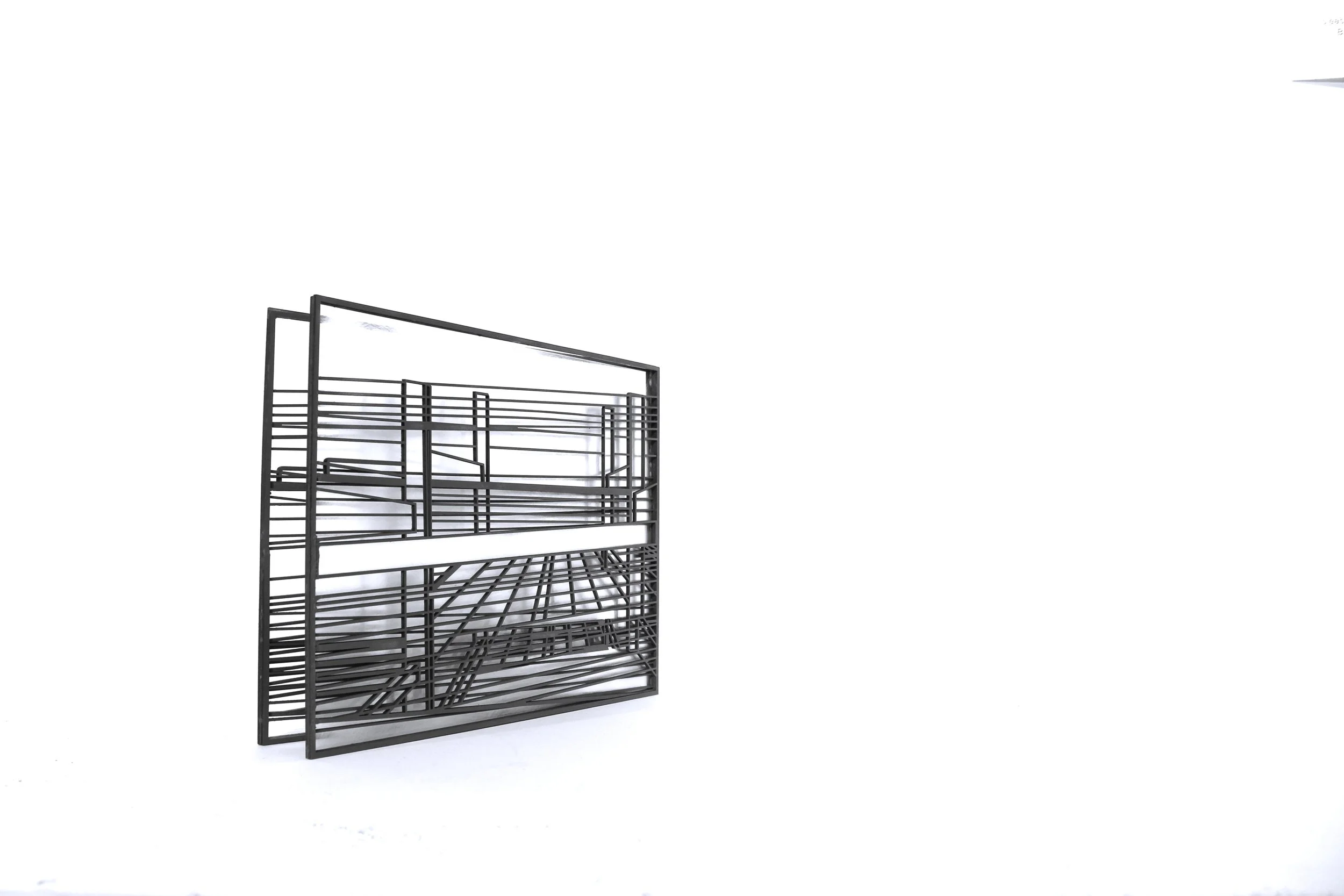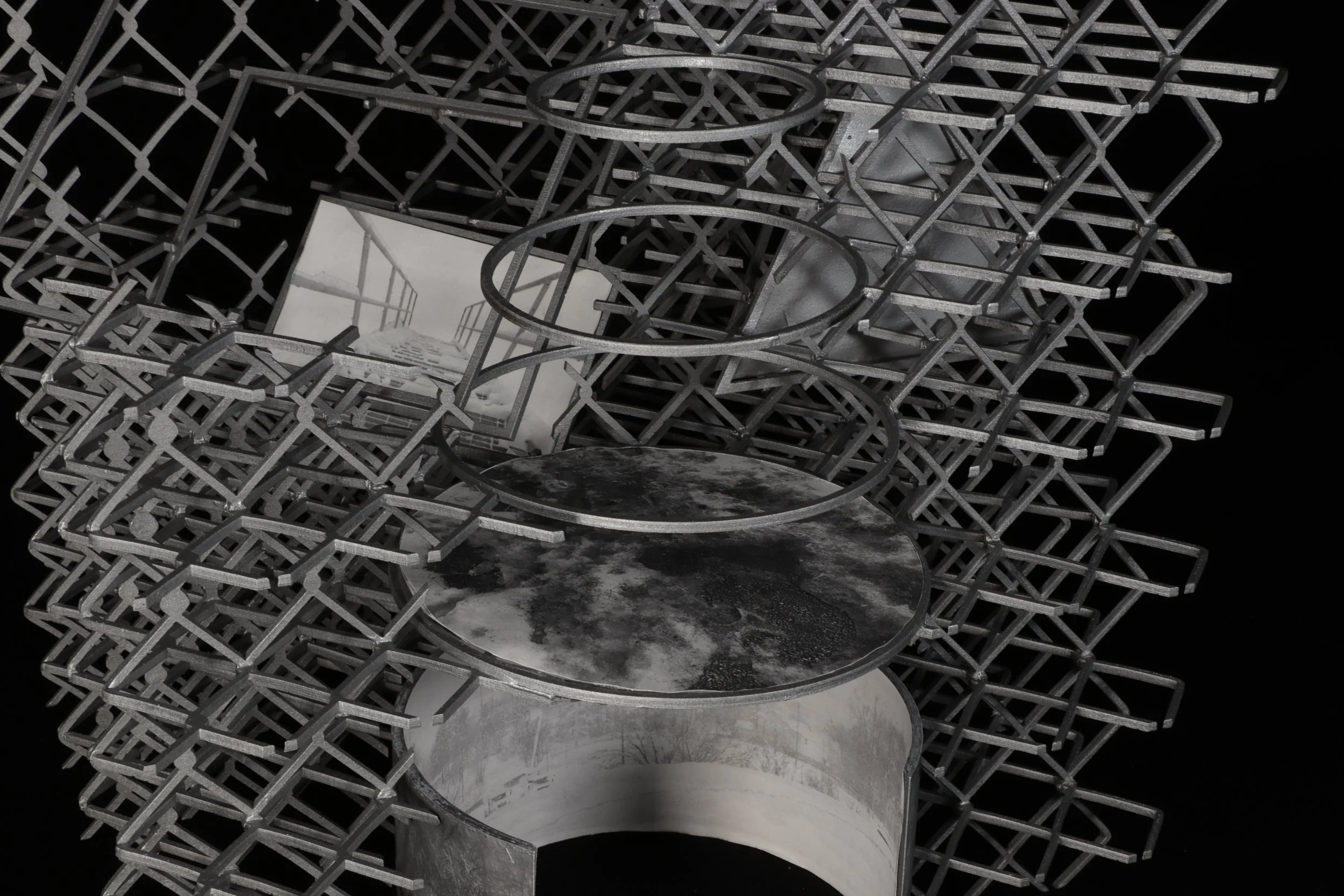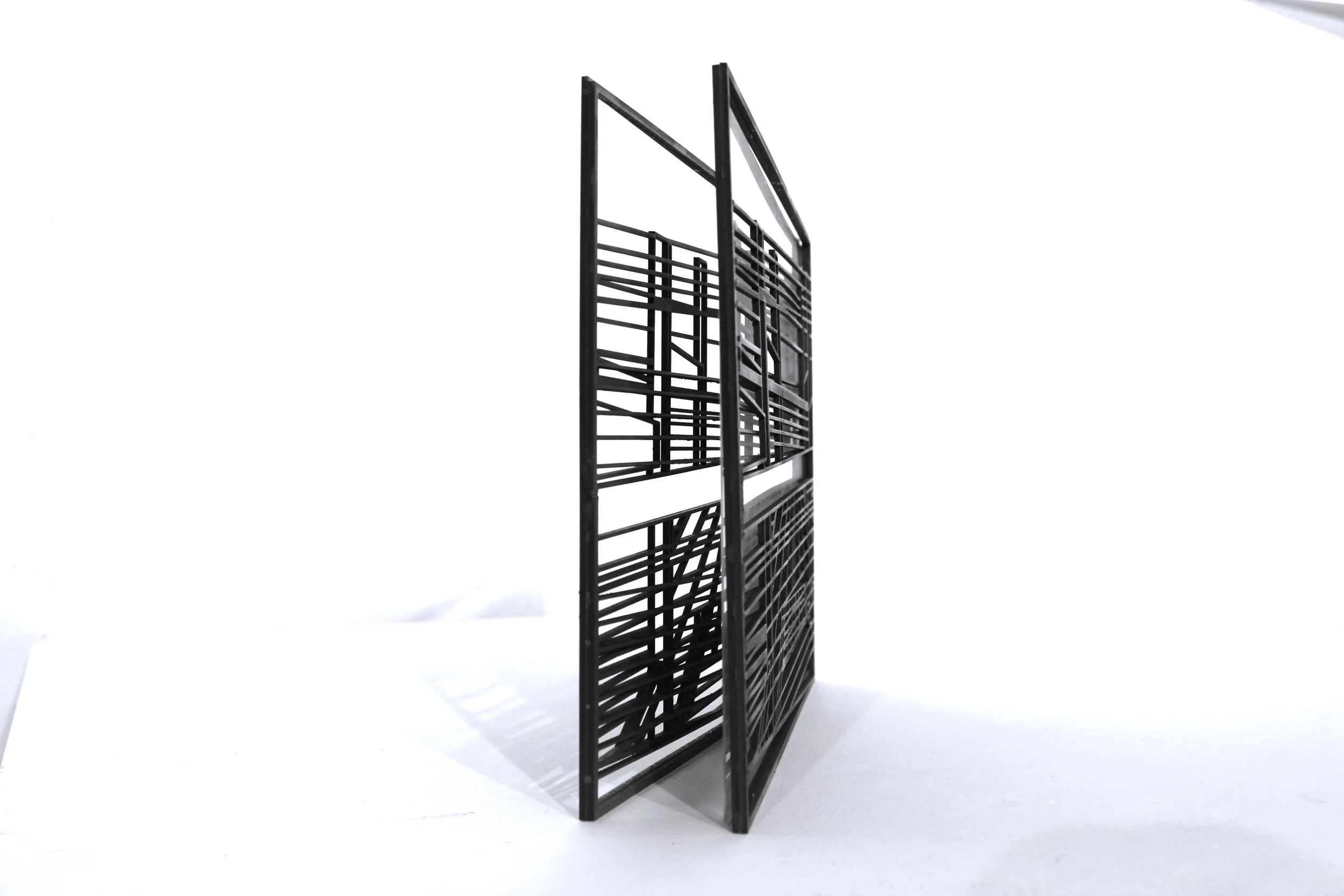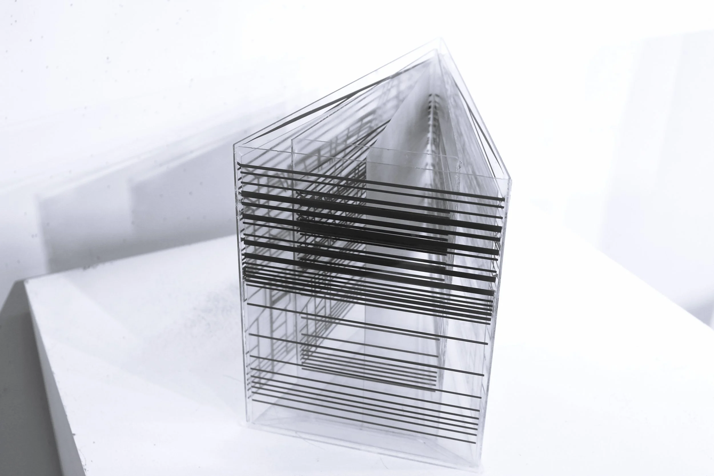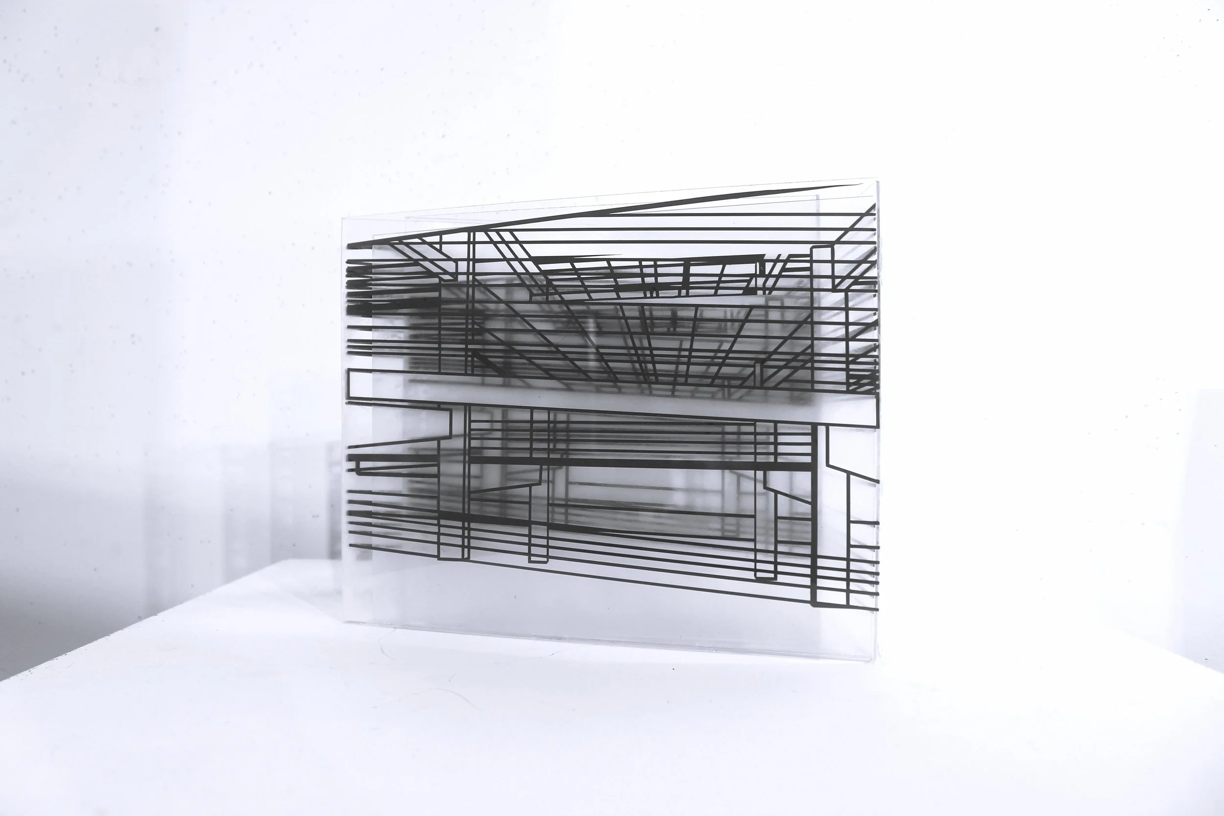 The site of the project is based at the Akron, Ohio campus of the Goodyear Tire & Rubber Company. The initial steps of the project included me photographing the raw aspects of the company's campus. I looked at the repetition of patterns, disruptions in surfaces, imperfections, and natural decay. I then chose my most powerful image to act as inspiration for my Site-Image and Object-Image. The strongest figures came from the photocopy quality of the lines that ran vertically across the image and the shadows that acted as strong defining figures. My Site-Image was shadow-based. I approached the photo as a grey-scale abstract image and blocked off the spaces based on tonality. This gave a minimal recreation of the structure of the parking garage. I then pulled the lightest tones closest to the viewer and the darkest tones furthest. This created pockets that allowed for shadows to create the more dense tones and for the lighting to hit the brightest parts. It created a Site-Image that when viewed from a different perspective, doesn’t give off the impression of being a parking garage, but when viewed from a direct front-facing angle, it recreates the image. My Object-Image took inspiration from the linearity of the photograph. I traced all of the lines of the image. It not only recreated the structure but brought light to the lines that the eye tends to skip over when viewing the image. It allowed for there to be a stronger focus on the hidden lines that the viewer tends to neglect. I took the flat line drawing and added perspective by creating an acute triangle with the linework, and a scaled-down version within. That paired with the addition of sanded acrylic gives off the illusion of space within the flat surface.