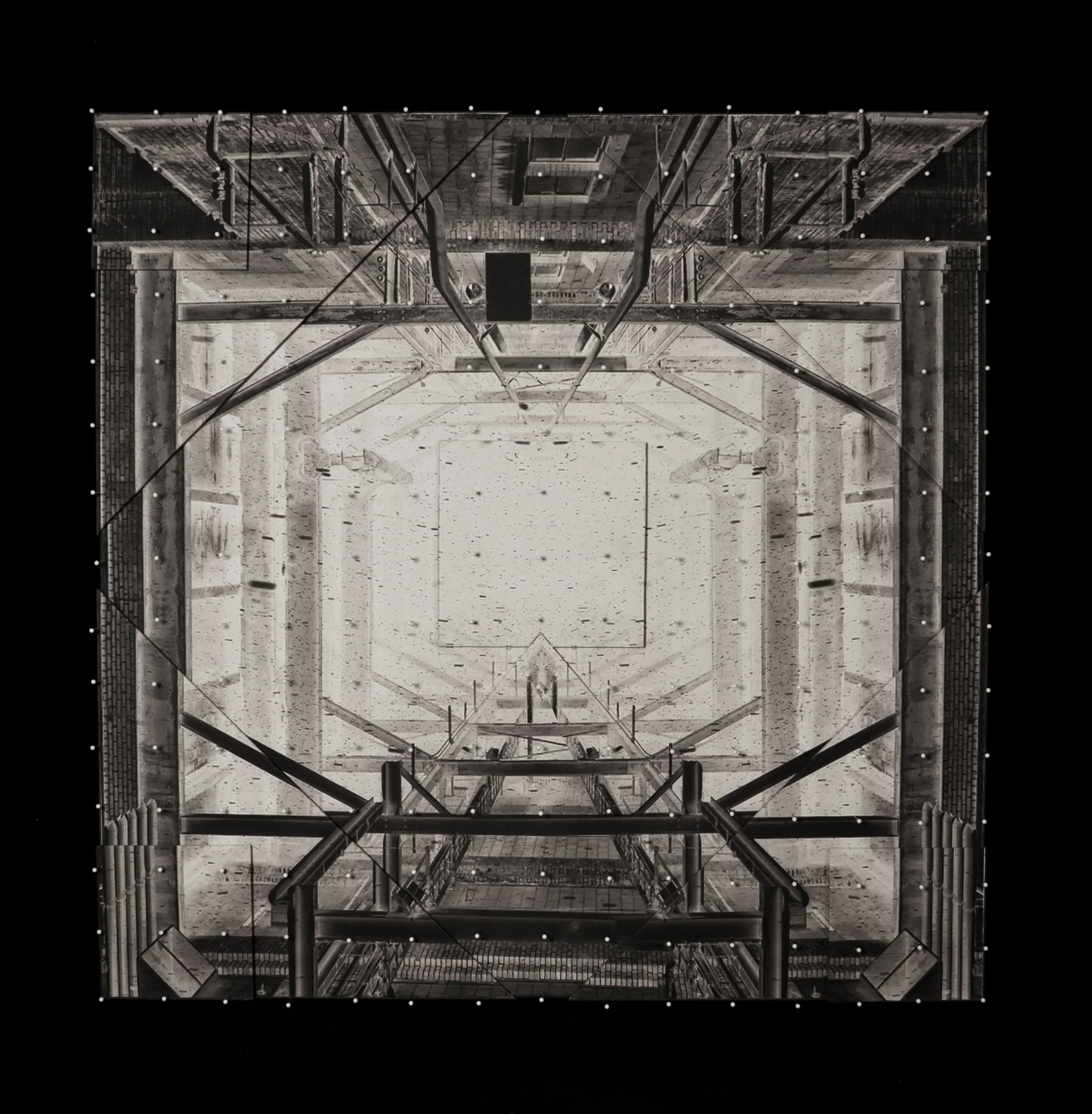 A tunnel within the structure at the Goodyear headquarters in Akron was the inspiration used to create a new site image. The image highlights the structural members, rhythmically placed throughout an unseen part of the facility. This new site image mirrored the negative of the original photo and uses superimposition images to create slippage between the layers in shallow relief. The pins highlight the process of attachment in the construction of the site image similar to the image highlighting the structural steel members. The photo-negative technique uses glare to create or achieve certain liquidity.